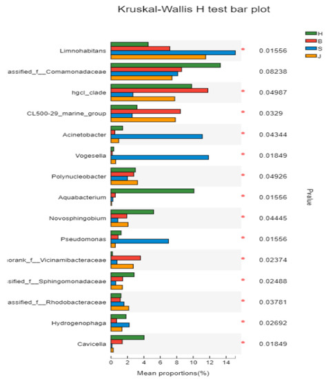 In this study, the Kruskal–Wallis H test was used to analyze the species difference of the samples. As seen in Figure 7, each group contained the genus Limnohabitans, the genus unclassified_f_Comamonadaceae, and the genus of the Hgcl_clade with a relatively high relative abundance. Compared with other groups, the species with significant differences in the Shapingba District were Acinetobacter [37], Vogesella, and Pseudomonas, all of which had a higher relative abundance, whereas Cavicella had a lower relative abundance. The species with significant differences in the Hechuan District were Aquabacterium, Novosphingobium, and Cavicella with a higher relative abundance, whereas norank_Vicinamibacteraceae had a lower relative abundance. The species with significant differences in the Beibei District had a higher relative abundance of norank_Vicinamibacteraceae and a lower relative abundance of Vogesella. The species with significant differences in the Jiangbei District were Acinetobacter, Vogesella, and Aquabaterium; all of which had relatively low relative abundances.