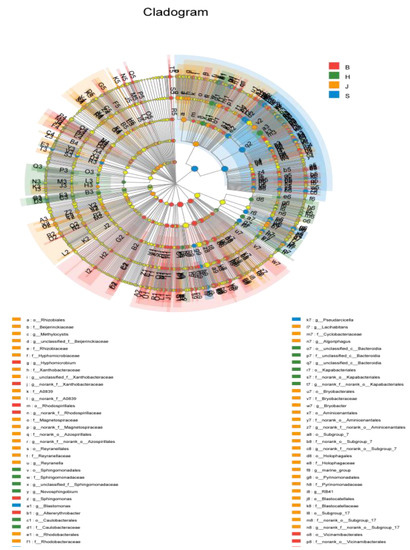 H represents the Hechuan District, S represents the Shapingba District, J represents the Jiangbei District, and B represents the Beibei District; the yellow nodes represent five significantly different species, the colored nodes represent species with significant differences, and the corresponding colors represent the corresponding regions.