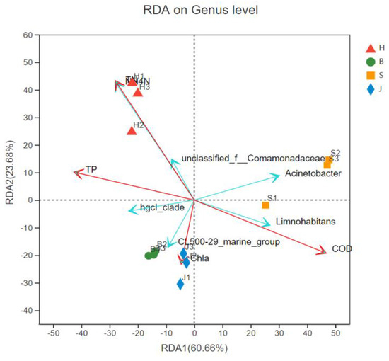 Correlation analysis between community structure and environmental factors. (H represents the Hechuan District, S represents the Shapingba District, J represents the Jiangbei District, and B represents the Beibei District. The longer the red arrow, the greater its influence and the longer the blue arrow, the greater its abundance, COD represents chemical oxygen demand, NH4N represents ammonia nitrogen, and Chla represents chlorophyll A.).