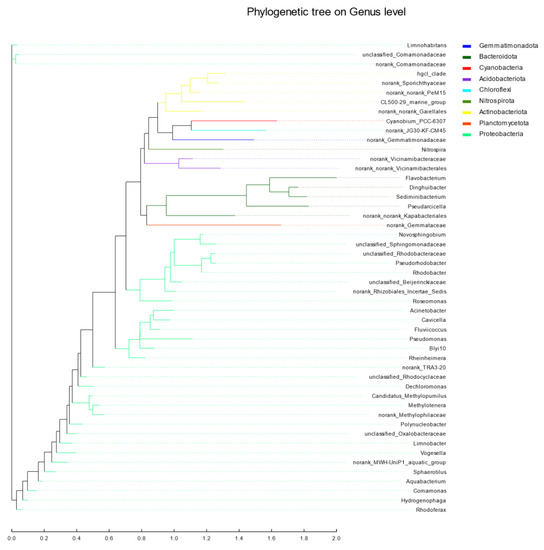 An evolutionary analysis was comprehensively considered using the maximum likelihood method [42]. As seen in Figure 10, the evolutionary distance between Methylotenera and norank_Methylophilaceae was relatively close. The evolutionary distance between unclassified_Rhodobacteraceae and Pseudorhodobacter as well as Novosphingobium and unclassified_Sphingomonadaceae was also relatively close. Dinghuibacter and Sediminibacterium were relatively close; the Hgcl_clade and norank_Sporichthyaceae were also relatively close. By an ML maximum likelihood analysis, it was ascertained that the evolutionary distance between Methylotenera and norank_Methylophilaceae was relatively close. There was an unclassified evolutionary distance between Rhodobacteraceae and Pseudorhodobacter. Novosphingobium had a close evolutionary distance to unclassified_Sphingomonadaceae. Dinghuibacter and Sediminibacterium had a close evolutionary distance and the evolutionary distance between the Hgcl_clade and norank_Sporichthyaceae was also close. Based on the above experimental results, the analysis of Heatmap and RDA shows that Limnohabitans, unclass_f_comamonadaceae and hgcl_clade are the dominant bacterial groups in the Jialing River waters in Chongqing during the wet season, indicating that the prokaryotic community in this watershed has high genetic diversity. Its distribution is greatly affected by ammonia nitrogen and chemical oxygen demand.