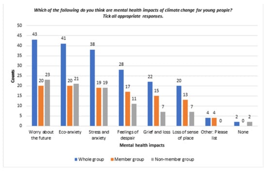 Eco-anxiety. A total of 41 out of 46 (89%) participants chose “eco-anxiety” as a likely mental health impact of climate change. A higher percentage of participants in the member group selected “eco-anxiety” (n = 20, 95% vs. n = 21, 84%) than in the non-member group.