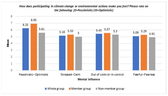 Optimistic. The survey demonstrated that young people felt more optimistic (mean: 6.25) when they participated in climate change or environmental actions. Notably, the mean of optimistic feelings in the member group was higher than in the non-member group (mean: 6.95 vs. 5.61).