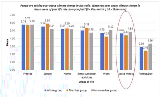 Figure 3 presents participants’ responses to talking about climate changes in different areas of life. Mean scores greater than 5 indicate optimistic feelings. These included “with friends my age”, “at university or school”, “at home” and “in my extra-curricular activities”. Conversely, the mean scores of the other three areas of life including “at work”, “on social media” and “in politics and government” were lower than 5.