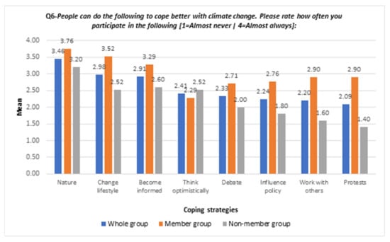 Figure 4 refers to the use of coping strategies by the survey participants. For the whole group, the highest participation or use of coping strategy was “contact with nature” (mean: 3.46) and the lowest frequency was “participate in climate and environmental protests” (mean: 2.09).