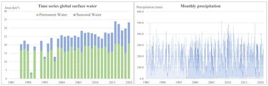 An increase in yearly surface water extent was found in the study area, from 20.4 km2 in 1998 to 33.4 km2 in 2020 (Figure 4). The analysis indicated that an increase in the amount of seasonal water was observed from 2000. According to the statistical test described in Section 2.4, positive increase trends were found in both permanent and seasonal water. Furthermore, a higher slope of 0.30 was found in seasonal water than in permanent water (0.12). In comparison, no trends were statistically identified from the monthly precipitation during 1985/2020 in the study area.