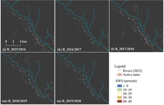 The SWO < 50 observed during 1984–2020 was extracted, as described in Section 2.4, showing a total extent of 0.25 km2 in the study area. The SWOs in the Galangan area were as follows: 1–9% (75.1%), 10–19% (19.8%), 20–29% (4.1%), 30–39% (0.6%), and 40–49% (0.3%). Moreover, the SWOs in the Kalanaman area were as follows: 1–9% (64.8%), 10–19% (22.7%), 20–29% (9.1%), 30–39% (2.6%), and 40–49% (0.9%). Furthermore, the results were overlayed on the possible active R-C-ASGM sites found in Section 3.1 (Figure 6). Notably, a higher density of SWO was observed in the central of the Galangan area (A in Figure 6). In comparison, a lower density of SWO was observed in surrounding areas. Their distributions were toward the eastern, northern, and southern areas from the center of the Galangan area. Water areas separately identified in the southern part exhibited relatively lower SWOs. In comparison, relatively lower SWOs were observed along the Kalanaman River in the Kalanaman area (B in Figure 6). Slightly higher SWOs were found at approximately 3 km intervals along the river. Conversely, lower SWOs were found in the northern and southern parts of the river. Fewer pixels were observed, primarily in the river’s northern part. According to the overlay analysis, notably, possible hotspots of active mines were mostly observed in similar areas with SWO < 50 during the study period.