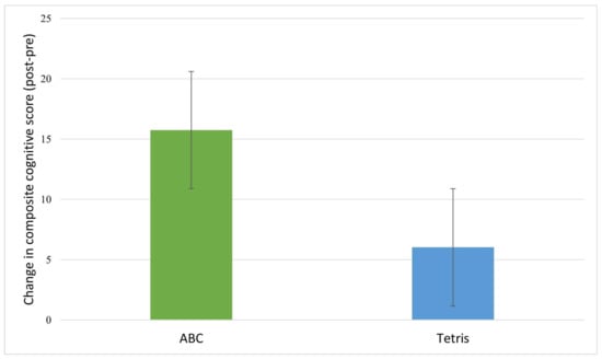Table 4 provides the mean change scores by group and results of ANCOVAs assessing between-group differences in cognitive score changes. Inspection of the cognitive change scores revealed that post-intervention, the treatment (ABC) group showed greater increases in composite cognitive function (
