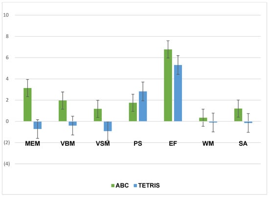 p = 0.50). Paired-sample t-tests of the individual cognitive tests revealed that the ABC group showed significant improvements in MEM, VBM, PS, and EF (