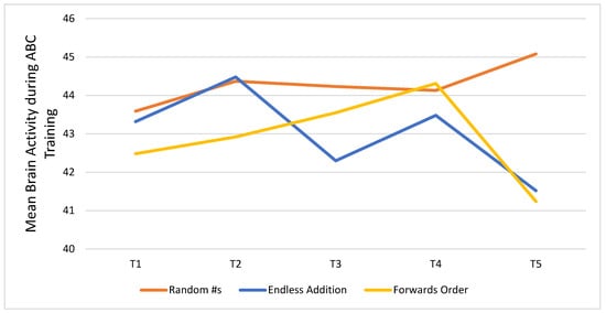 Figure 5 shows trends in brain activity measured after every five days of participation in the CT-NF ABC program. Results are shown for each of the three games participants played: Random Numbers (RN), Endless Addition (EA), and Forwards Order (FO). Inspection of the plot showed that participants’ mean brain activity peaked at T5 for RN, and the change from T1 (43.59) to T5 (45.08) was significant (