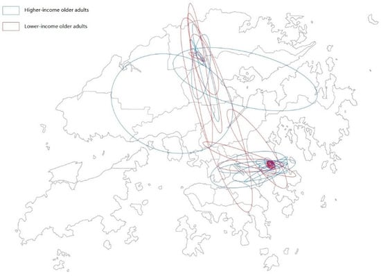 Figure 2 illustrates where the participants lived and the extensity patterns based on SDE. Table 3 reports differences in the activity spaces between lower- and higher-income older adults using Wang’s seven variables. As hypothesized, there were no differences between the two groups in terms of activity space extensity and diversity. However, the extensity of the activity space was, on average, higher among higher-income older adults than lower-income older adults. Moreover, despite a smaller activity space, lower-income older adults spent longer amounts of time participating in out-of-home activities. This suggests that lower-income older adults may spend more time outside of their homes at specific places for various activities. Lower-income older adults also spent more time at places with a higher provision of public services than higher-income older adults. This suggests that spaces with higher levels of public service provisions are probably a more important part of the daily lives of lower-income older adults. By contrast, higher-income older adults might be more likely to go further away to where there may be higher quality and more choice in services.