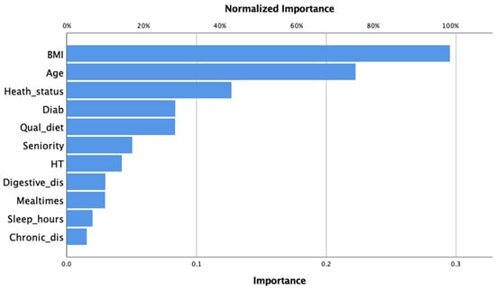 From the model obtained, the most important independent variables were BMI (0.295); the higher values were related to BO, and lower age contributed to BO (0.223). Meanwhile, the worst health status contributed to being the third most important variable (0.127), and less critical were fewer sleeping hours (0.02) and the presence of chronic diseases (0.015) (Figure 1).