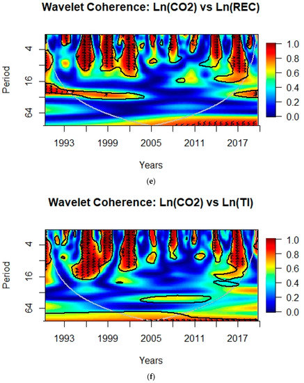 In Figure 1c, between the 0–16 period scale, from the years 1993 to1994, 2001 to 2003, and 2016 to 2018, a strong correlation with the arrows pointing to the right mostly are exhibited, indicating that the CO2 emissions are in-phase with import. From 1995 to 2001 and 2011 to 2015, a strong positive correlation between CO2e and import was also exhibited, around 32 periods of quarterly time scales. A strong positive in-phase correlation is observed between CO2e and export in the years 1992 to 1994, 1995 to 1997, 2001 to 2003, 2007 to 2009 and 2016 to 2018 between 0–16 periods of quarterly scales, and at the quarterly period of 28–48 in the years 1995 to 2006 and 2012 to 2015. Mutascu et al. [97] studied the relationship between CO2e and trade openness in the European Union using the wavelet coherence approach and found that CO2e was positively related to imports and exports from 2006 to 2010 and 2007 to 2008, respectively.