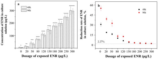 The residual (a) and rate of reduction in (b) ENR concentrations in the algae culture solution under different exposure dosages at 48 h and 96 h. The number of “*” was referred as the significant between-group variance. The same number means no significant difference, whereas the different number means the significant difference.