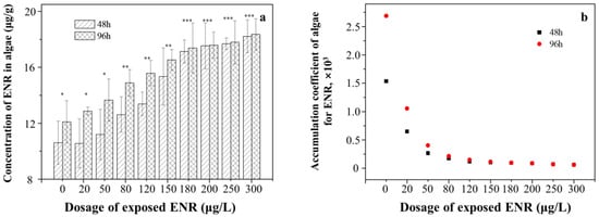 The accumulation of ENR in algae under different exposure dosages at 48 h and 96 h. (a) The amount of accumulated ENR; (b) the accumulation coefficient of ENR. The number of “*” was referred as the significant between-group variance. The same number means no significant difference, whereas the different number means the significant difference.