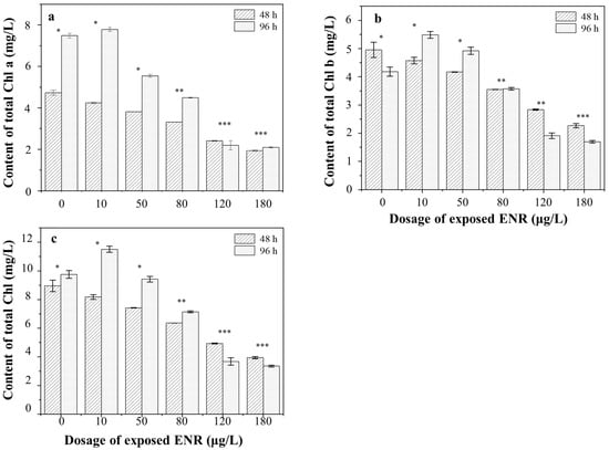 The chlorophyll contents in algae under different exposure dosages of ENR. (a) Chl a content; (b) Chl b content; (c) Total Chl content. The number of “*” was referred as the significant between-group variance. The same number means no significant difference, whereas the different number means the significant difference.