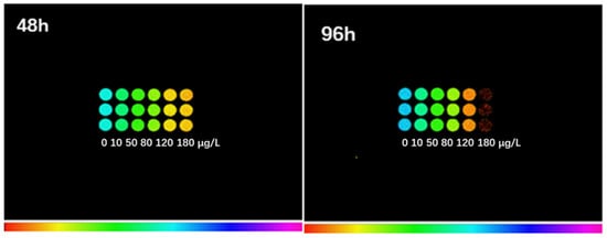 The Fv/Fm of S. obliquus after treatment with 10, 50, 80, 120, and 180 μg/L of ENR for 48 h and 96 h was also measured using a chlorophyll fluorometer (Figure 5) The detected color of the treated groups changed from blue or green to yellow or orange, and finally to red. With the extension of the treatment time, the orange of the algae in the 120 μg/L group deepened, and the algae in the 180 μg/L group turned red at 96 h.