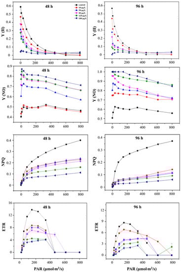 The Y (II) of S. obliquus after treatment with 10, 50, 80, 120, and 180 μg/L of ENR for 48 h and 96 h is shown in Figure 6. It can be observed that Y (II) exhibited a significant decreasing trend with the ENR concentration under the same light intensity that was more obvious under a low light intensity. With the increase in light intensity, the Y (II) of S. obliquus gradually decreased and tended to be stable after reaching a certain light intensity. In addition, it can be observed that under the same light intensity, the Y (NO) in each treatment increased with the concentration of ENR. For example, under the light intensity of 80 µmol m−2/s, the Y (NO) increased by 1.03, 1.44, 1.58, 1.59, and 1.68- fold, respectively, at the concentrations of 10, 50, 80, 120, and 180 μg/L compared with the control after 48 h of treatment.