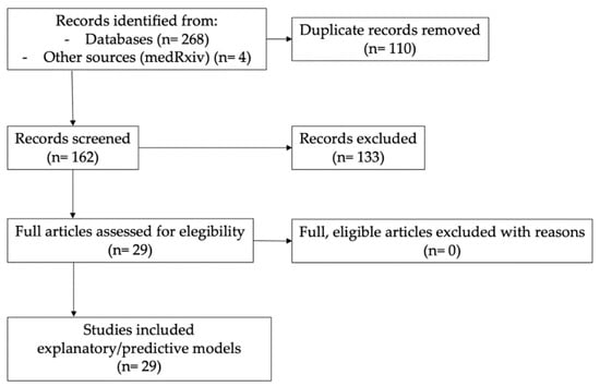 - Search details: ((“COVID-19”[All Fields] OR “COVID-19”[MeSH Terms] OR “COVID-19 vaccines”[All Fields] OR “COVID-19 vaccines”[MeSH Terms] OR “COVID-19 serotherapy”[All Fields] OR “COVID-19 serotherapy”[Supplementary Concept] OR “COVID-19 nucleic acid testing”[All Fields] OR “COVID-19 nucleic acid testing”[MeSH Terms] OR “COVID-19 serological testing”[All Fields] OR “COVID-19 serological testing”[MeSH Terms] OR “COVID-19 testing”[All Fields] OR “COVID-19 testing”[MeSH Terms] OR “SARS-CoV-2”[All Fields] OR “SARS-CoV-2”[MeSH Terms] OR “severe acute respiratory syndrome coronavirus 2”[All Fields] OR “ncov”[All Fields] OR “2019 ncov”[All Fields] OR ((“coronavirus”[MeSH Terms] OR “coronavirus”[All Fields] OR “cov”[All Fields]) AND 2019/11/01:3000/12/31[Date—Publication])) AND (((“predict”[All Fields] OR “predictabilities”[All Fields] OR “predictability”[All Fields] OR “predictable”[All Fields] OR “predictably”[All Fields] OR “predicted”[All Fields] OR “predicting”[All Fields] OR “prediction”[All Fields] OR “predictions”[All Fields] OR “predictive”[All Fields] OR “predictively”[All Fields] OR “predictiveness”[All Fields] OR “predictivities”[All Fields] OR “predictivity”[All Fields] OR “predicts”[All Fields]) AND (“model”[All Fields] OR “model s”[All Fields] OR “modeled”[All Fields] OR “modeler”[All Fields] OR “modeler s”[All Fields] OR “modelers”[All Fields] OR “modeling”[All Fields] OR “modelings”[All Fields] OR “modelization”[All Fields] OR “modelizations”[All Fields] OR “modelize”[All Fields] OR “modelized”[All Fields] OR “modelled”[All Fields] OR “modeller”[All Fields] OR “modellers”[All Fields] OR “modelling”[All Fields] OR “modellings”[All Fields] OR “models”[All Fields])) OR (“explanatory”[All Fields] AND (“model”[All Fields] OR “model s”[All Fields] OR “modeled”[All Fields] OR “modeler”[All Fields] OR “modeler s”[All Fields] OR “modelers”[All Fields] OR “modeling”[All Fields] OR “modelings”[All Fields] OR “modelization”[All Fields] OR “modelizations”[All Fields] OR “modelize”[All Fields] OR “modelized”[All Fields] OR “modelled”[All Fields] OR “modeller”[All Fields] OR “modellers”[All Fields] OR “modelling”[All Fields] OR “modellings”[All Fields] OR “models”[All Fields])))) AND (clinicaltrial[Filter] OR controlledclinicaltrial[Filter] OR meta-analysis[Filter] OR pragmaticclinicaltrial[Filter] OR randomizedcontrolledtrial[Filter] OR systematicreview[Filter])