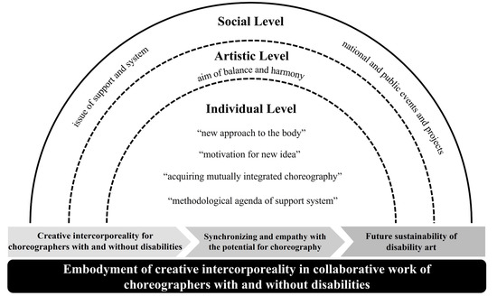 This study attempted a qualitative approach focusing on the experience and interaction process of collaborative work among choreographers with and without disabilities in that the quality of the experience is important, emphasizing the essential role of oneself and other egos in social understanding. To explain this in detail, this study borrowed Shogo Tanaka’s concept of “intercorporeality” of “connection and empathy of cognition and behavior occurring in interrelationships between independent egos” [39].