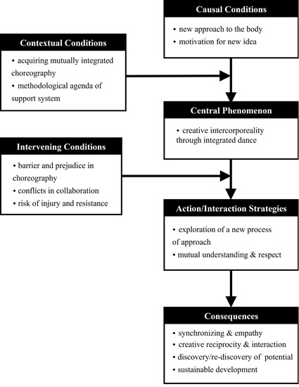 Central phenomenon is defined as how a certain phenomenon is handled or progressed, and experience or core issue commonly shared by the research participants, as well as a key event to which action and interaction are related. As a result of the analysis, awareness of creative intercorporeality in choreography was the core phenomenon and was more specifically classified into balanced exploration of disability related expressions, empathy from potential behavior, and acquiring mutually integrated choreography. This experience was became an important turning point for the research participants because they were able to develop a new perspective on disabilities, breaking their prejudice or bias after participation, claiming that they attempted to find the balance point in expression or lead the space through potential behavior. In particular, “creative intercorporeality through integrated dance” was the consequence of causal conditions and described by the participants as an important disability art experience in the context of creative intercorporeality; thus, it was presented as the central phenomenon.