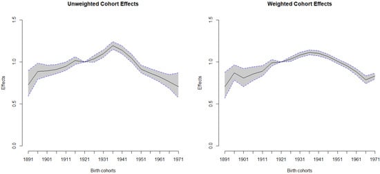 As stated in the mortality in the cohort in question, age was computed as the removed and unremoved influence of the cohort on deciding the reference categories. Moreover, in terms of cohort-specific mortality, there was minimal dissimilarity in the reference categories of cohorts with and without cohort influence. Following the previous research [], after discarding influencing elements, the reference concerning the birth cohort could be ascertained based on the minute variation in its rate. It should be noted that we estimated the cohort effects for men and women.