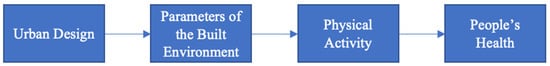 To improve public health, many efforts have been made to shape healthy lifestyles for citizens, and urban design (which directly changes the human-made built environment) has played an essential role [,]. For example, the ‘Heathy Cities’ movement, initiated by the World Health Organization and well received worldwide [,], has acknowledged the importance of improving the built environment through urban design, as a way to support citizens in performing a healthy lifestyle. The assumption in the policy effort and the studies that promoted them are shown in the causal chain (Figure 1): when people live more active lives, their general health will increase. As people’s living environment can either facilitate or block such a lifestyle, good urban design of the built environment (BE) can make people healthier by affecting their physical activity (PA).