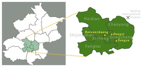 - Office for the Sixth Population Census of Beijing Municipality; Beijing Municipality Bureau of Statistics; Survey Office of the National Bureau of Statistics in Beijing. Tabulation on the 2010 Population Census of Beijing Municipality (Town and Sub-District Volume); China Statistics Press: Beijing, China, 2010.