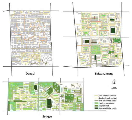 For physical activity levels, abundance and quality of sidewalks are key. Figure 4 indicates that the sidewalks occur in well-connected webs in Baiwanzhuang and Songyu neighborhoods, but less so in Dongsi, when we would focus on the number of cross-sections (the three-leg sidewalk intersections are 75, 153, 167 per square kilometer for Dongsi, Baiwanzhuang, and Songyu, respectively). In the Dongsi neighborhood, the traffic structure is simple and clear-seven east–west straight roads go through the neighborhood, and several north–south alleys connect the roads. The narrowness of the alleys makes it difficult for cars to go through them, thus making the north–south alleys pedestrian- and cyclist-friendly. Furthermore, the clear east–west road structure enhances accessibility to facilities such as shops and restaurants, despite the fact they are located mainly along the boundaries of the neighborhood.