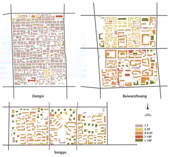 From the perspective of residential density, the historical neighborhood of Dongsi has a low density (14,943 people per square kilometer for Dongsi, and 30,392, 33,333 for Baiwanzhuang and Songyu respectively), and is therefore disadvantageous for walking and cycling (according to Table 1). Baiwanzhuang has mainly 3- to 5-floor residential buildings built in the 1950s, and 6-floor buildings built in the 1970s to 1980s. Songyu is a neighborhood built in the 1990s, and contains residential buildings of 5 to 7 floors, together with tower buildings of 16 to 20 floors. In the latter two neighborhoods, the dwelling units are usually 30 to 40 square meters, which is quite standard for the time they were built. Unlike these two neighborhoods, most residential buildings in the Dongsi neighborhood are Siheyuan, where the housing unit is large in area but with only a ground floor (Figure 6).