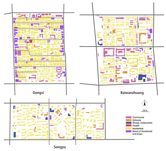 Neighborhood design in China has gone through several phases. Since the 1940s, Chinese neighborhood planning strategies have shifted under the significant impact of soviet and western planning ideas []. Economic development is another impact factor that has brought changes in planning strategies []. We categorized the neighborhoods into four typologies according to different planning strategies (Table 2). Our study cases represent the first three neighborhood types.