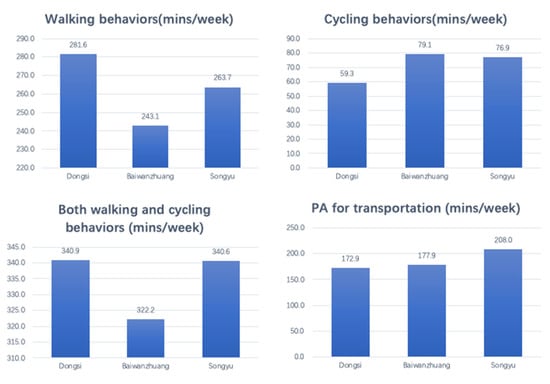 More walking behavior took place in Dongsi (281.6 min/week), followed by Songyu and Baiwanzhuang with 263.7 and 243.1 min/week (Figure 8). Cycling duration was similar in Baiwanzhuang and Songyu, and least cycling occurred in Dongsi (76.9, 79.1 and 59.3 min/week).