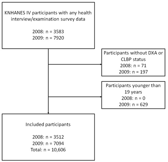 In this population, we included people with data from both the health interview survey and health examination survey. We excluded those without DXA measurements or information on CLBP status. We also excluded people aged 18 years or younger, since the minimum age of those with CLBP data was 19 years, although the KNHANES IV targeted citizens aged 10 years or older.