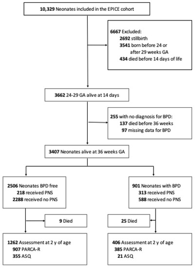 Study Flow Chart. Abbreviations: EPICE, Effective Perinatal Intensive Care in Europe; GA, gestational age; BPD, bronchopulmonary dysplasia; PNS, postnatal steroids; PARCA-R, Parent Report of Children Abilities–Revised; ASQ, Ages and Stages Questionnaire.