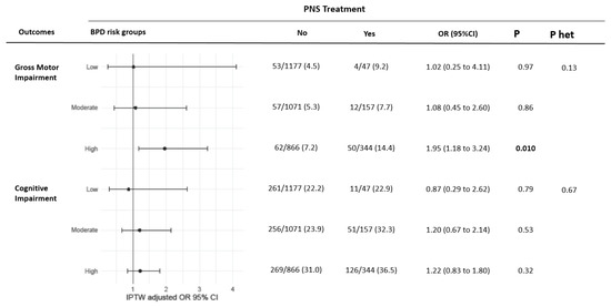 Association of PNS treatment with two-year neurodevelopmental outcomes according to BPD risk groups after IPTW adjustment. Values are reported as no./No. (%). P het indicates p for heterogeneity across BDP risk groups. Descriptive values, OR and p-value were calculated after handling missing values by multiple imputation. Abbreviations: IPTW, inverse probability of treatment weighting; OR, odds-ratio; CI, confidence interval.