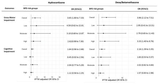 In the hydrocortisone subgroup, treatment was still associated with gross motor impairment in the global population after IPTW adjustment but no longer in the different risk groups (Figure 3, Supplemental Table S5). The OR before adjustment was 3.29, 95% CI, 0.67 to 16.15). For patients treated with dexamethasone or betamethasone, findings were consistent with our main results with higher rates of motor impairment in the overall population as well as in the high-risk group. Moreover, the rates of cognitive impairment were higher in the treated group compared with the control group: OR, 2.16 (95% CI, 1.39 to 3.35) while there was no difference with hydrocortisone.