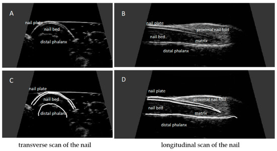 Ultrasonographic image of a healthy nail: transverse (A,C) and longitudinal view (B,D). Nail plates presented as a structure consisting of two parallel hyperechoic plates separated by a hypoechoic interlaminar space. Nail matrix presented as an isoechogenic structure in the proximal part of the nail. Nail bed presented as a hypoechoic structure between the ventral nail plate and the periosteum of the distal phalanx.