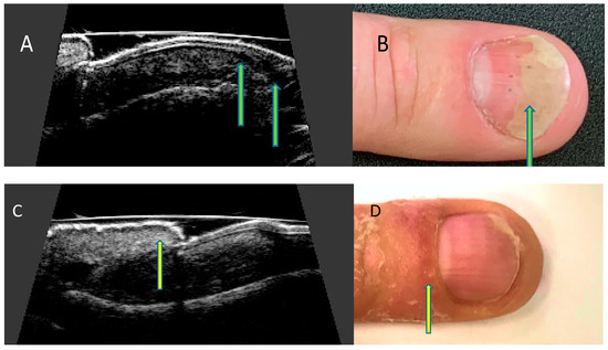 Ultrasonographic changes of the nail apparatus in psoriasis. Onycholysis. (A) Separation of the nail plate from the nail bed—ultrasound longitudinal view (arrows), (B) separation of the distal edge of the nail bed—nail (arrow). Inflammation of the posterior nail shaft. (C) Thickening of the nail shaft—ultrasound longitudinal view (arrow), (D) swelling of the nail shaft (arrow).