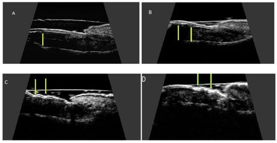 Ultrasonographic changes of the nail plate in nail psoriasis according to Wortsman classification. Longitudinal view. (A) focal hyperechoic involvement of the ventral plate—type I, (B) loss of the borders of the ventral plate—type II, (C) wavy plates—type III, and (D) loss of definition of both plates—type IV.
