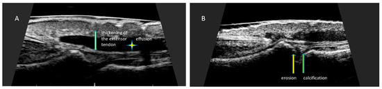 Grayscale assessed changes of the finger extensor tendon enthesopathy are consistent with enthesopathy of other sites and include thickening of the tendon, loss of its normal fibrous structure, presence of calcifications, presence of enthesophytes at the attachment site, and osseous changes including erosions (Figure 6).
