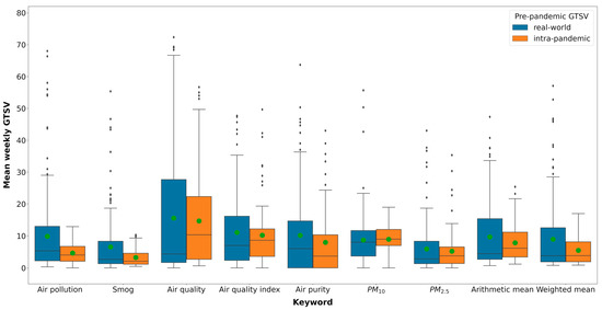 We found that, for most of the keywords, the weekly intra-pandemic GTSV decreased in comparison to the weekly pre-pandemic GTSV (Figure 1 and Table 2). The greatest decrease was observed for queries regarding “air pollution” and “smog” (−53.5% and −51.0%, respectively). For these keywords, a statistically significant difference between the pre- and intra-pandemic periods was observed. Moreover, for all keywords, a reduction of the interquartile range was noted. Overall, the arithmetic and weighted mean GTSVs changed by −18.7% and −39.0%, respectively. However, the differences were not statistically significant.