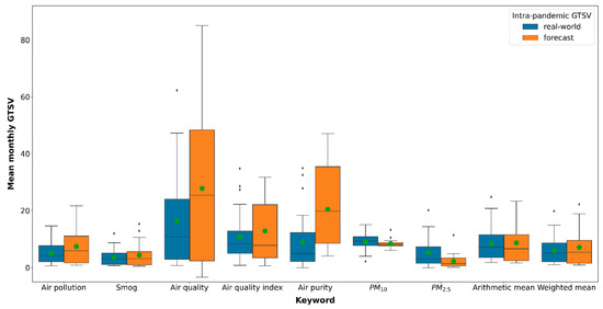 Except for the “PM10” and “PM2.5” terms, a reduction in the real-world intra-pandemic mean monthly GTSV in comparison to the forecasted mean monthly GTSV was observed (Figure 3, Table 3). The greatest decrease was observed for “air purity”,” air quality” and “air pollution” (−56.9%, −41.3% and −33.0%, respectively). Statistically significant differences between the forecasted and real-world data were noted for “air purity” and “PM2.5” only. For arithmetic means, only a slight decrease was observed (−3.3%), while for weighted means, a moderate decrease of −16.5% was noted.