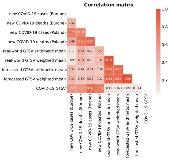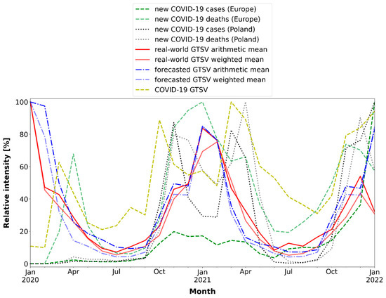 A number of daily new confirmed COVID-19 cases and new deaths in Poland and in Europe were acquired from the Our World in Data database [33]. To adjust the COVID-19 pandemic data to the GTSV data, monthly averages of the metrics were calculated. Additionally, monthly GTSVs for the “COVID-19” keyword in Poland for the intra-pandemic period were collected.