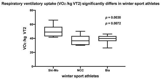 Respiratory ventilatory uptake (VO2/kg VT2) significantly differs in elite winter sports athletes (Ski-Mo vs. NCC, p = 0.0072; Ski-Mo vs. Bia, p = 0.0030).