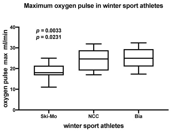 Peak oxygen pulse (Oxygen pulse maximum) significantly differs in elite winter sports athletes (Ski-Mo vs. NCC, p = 0.0231; Ski-Mo vs. Bia, p = 0.0033).