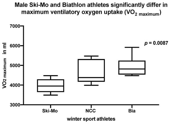 Maximum ventilatory oxygen uptake (VO2 maximum) significantly differs in elite male Ski-Mo and Bia athletes (p = 0.0087).