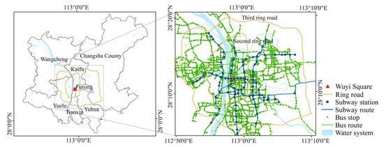 Changsha is the capital of Hunan Province, in the south-central part of China, with a total population of up to 10 million in 2020, governing 6 districts and 1 county. In Changsha, there are 6 metro lines, and 102 metro stations, and the average daily metro passenger volume is 1.21 million. There are also 291 bus lines, nearly 5000 bus stops, and the average daily bus passenger volume is 1.3 million. The daytime heat map of Changsha City provided by Baidu Map shows that most population activities are concentrated within the third ring road. Therefore, the area shown in Figure 1 is selected as the study area. Bus lines, metro lines, and ring roads are also plotted in Figure 1 based on data from the Open Street Map. According to the overall plan of Changsha City, Wuyi Square is the center of the city, with a large number of commercial and business lands clustered around it. Meanwhile, Wuyi Square Station is the first transfer station of Changsha Metro, marking the formation of the cross pattern of Changsha Metro.