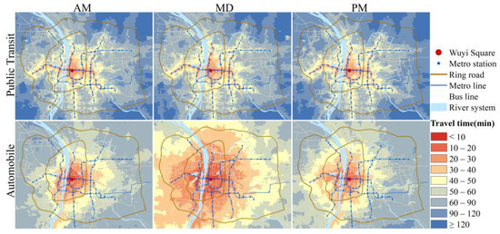 Firstly, we obtain the travel time and the actual travel fare of each unit in the study area to reach the city center and calculate the equivalent travel cost of each unit by converting the travel time into its monetary value using the average time value. Based on this, isochrone maps and iso-cost maps are made for the two modes at different hours. The results show that automobile-based CCA has significant temporal characteristics, with it being better during MD than peak hours, while PT-based CCA differences between peak and off-peak hours are pretty slight. Automobile-based CCA shows a concentric structure centered on Wuyi Square, and PT-based CCA has noticeable expansion along the metro lines, and these spatial characteristics exist at peak and off-peak hours. This indicates that automobile-based CCA is greatly influenced by road conditions. Due to bus and metro operating rules, PT-based CCA is little affected by traffic congestion. According to the metro scheduling rules in the study area, the metro departure interval is even shortened during the morning and evening peak hours to reduce the waiting time of passengers and transport more users. All these together lead to a slight difference between peak and off-peak hours in the PT-based CCA and a greater spatial dependence on the distribution of transport stations. And this is in line with what many researchers have pointed out: transport stations are virtual nodes in the study of PT accessibility.
