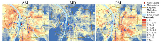 Table 1 also shows the mean time-ratio in the study area for the three time periods. The time-ratio equals PT-based travel time divided by automobile-based travel time for each unit (Equation (3)). A unit with time-ratio smaller than one means that it takes less time by PT than by automobile to reach the city center; time-ratio greater than one means the opposite. The time-ratio during MD is higher than during AM and PM. Because the automobile-based travel time decreases significantly at MD, while the PT-based travel time is relatively stable, leading to the time-ratio increases during MD. However, it should be noted that the mean time-ratio during all three periods is greater than one, implying that PT-based CCA is overall inferior to automobile-based CCA from the travel time perspective. The spatial distributions of time-ratio during three time periods are shown in Figure 3. It can be seen that there are fewer areas with time-ratio less than one during MD, and most of them are distributed around metro stations. The more extreme case, where the PT-based travel time is more than double the automobile-based (time-ratio > two), is concentrated in the northeast and southwest of the study area, where bus lines are scarce and there are no metro stations. At peak hours, traffic congestion causes automobile-based travel time to increase in some areas, and more areas appear with time-ratio less than one, but it can still be found that these areas are relevant to metro lines and stations.