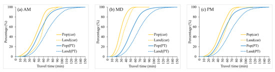 Growth curves of cumulative land and population percentages as travel time increases: (a) during AM; (b) during MD; (c) during PM.