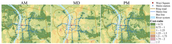 The spatial distribution of cost-ratio (Figure 6) shows that the automobile no longer prevails when travel cost is the CCA measure, especially at peak hours. Cost-ratio in most areas is less than 1, which means at peak hours, there are many areas where the travel cost reaching the city center by PT is lower than that by automobile. Moreover, values of cost-ratio show a trend of gradually decreasing from the center to the periphery, meaning the travel cost advantage of PT is gradually evident from the center to the periphery, and the surroundings of metro stations always have a smaller cost-ratio. During MD, the areas with cost-ratio less than one decrease compared to peak hours, indicating the advantage of PT declines compared with peak hours.
